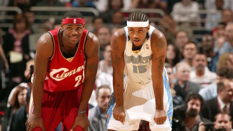 勒布朗·詹姆斯在俄亥俄州圣文森特-圣玛丽高中就读期间就吸引了媒体的关注。他凭借出色的个人表现带领球队取胜,荣膺俄亥俄州篮球先生称号,并连续三个赛季入选《今日美国》全美最佳阵容第一队。[ 10 ]在他高中毕业前,他曾试图绕过NBA规定球员必须完成高中学业才能参加选秀的规定。[ 11 ]他的请求被驳回,但他的高四赛季仍然获得了广泛的媒体报道,他的一些比赛甚至在有线电视频道播出。