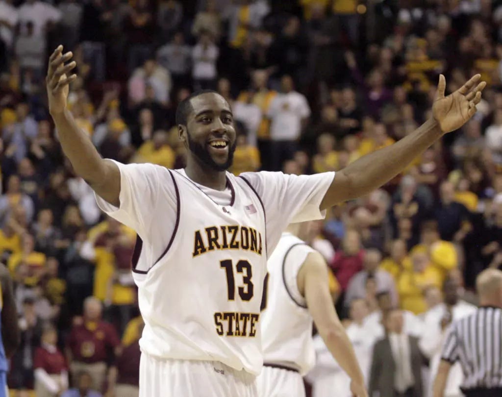 2008年全国邀请赛中,哈登带领亚利桑那州立大学击败了阿拉巴马州立大学和南伊利诺伊斯大学,但在决赛中败给卫冕冠军佛罗里达大学。2008年11月30日,在击败UTEP的比赛中,哈登得到大学时代最高分40分。